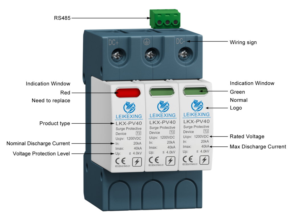 DC surge protectors typically have three wiring ports, namely V+, V -, and PE. V+is connected to the positive pole of the DC system, V – is connected to the negative pole, and PE is connected to the ground wire.